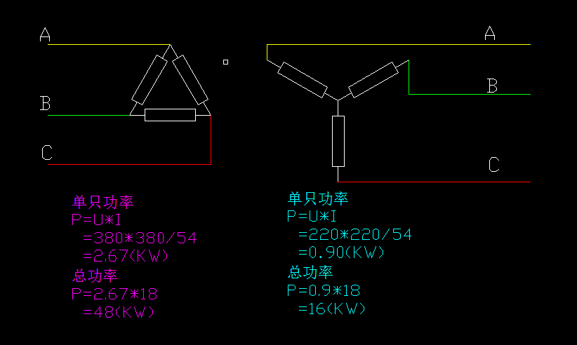 差不多,假設電壓是380v,三角形接法,六個一組并聯做接一相,單個功率2674W,總功率27789W。