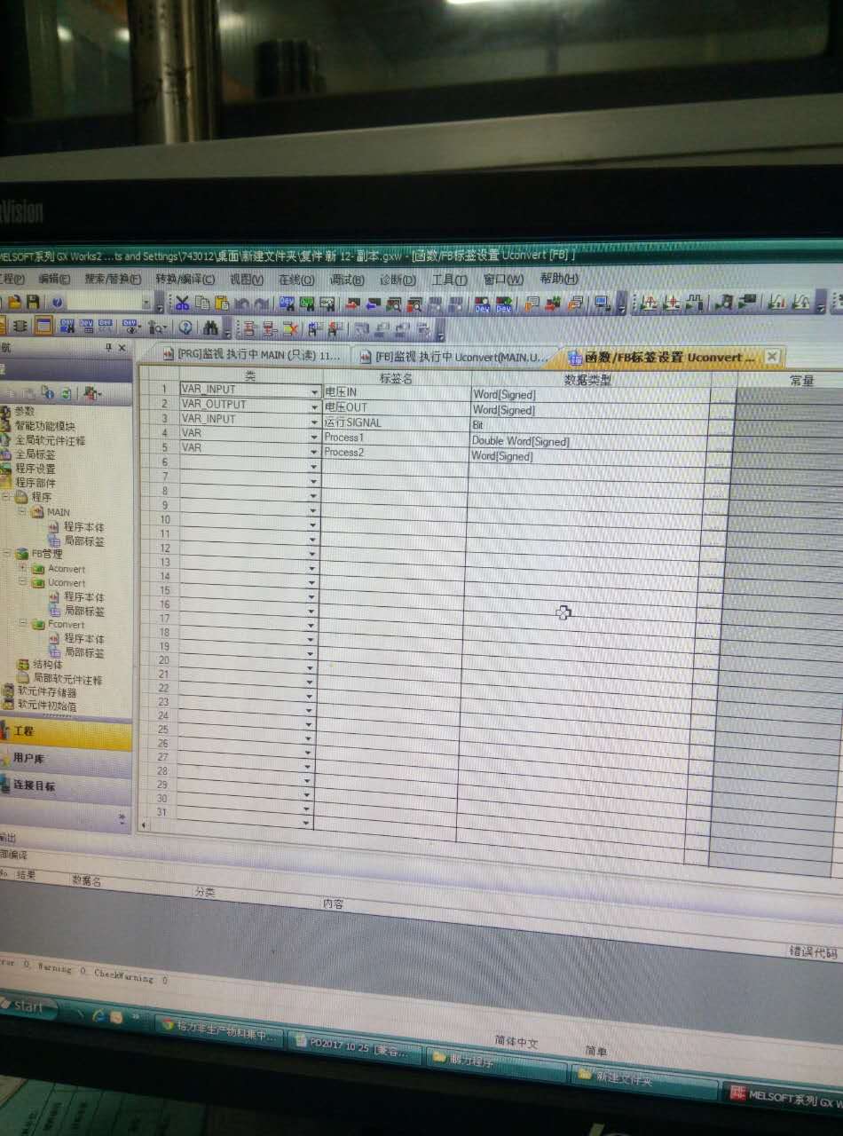 var的值不保持我能理解,可關鍵是var out輸出的值都不對,仿真模擬的時候是對的。我把程序上傳一下,大俠們幫忙看看,第一次碰到這種問題,之前是用過西門子的FB,這次說是試一下三菱的就出現了這種問題,打三菱客服說是讓我清除內存試一下,下載后有CPU有時會出現4101報錯。