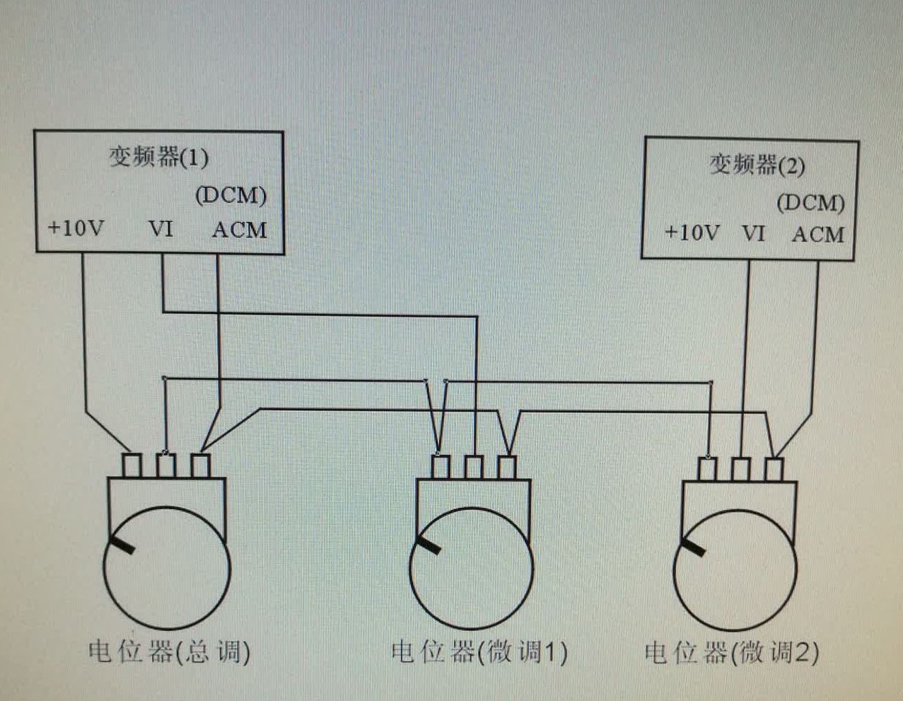 引用引用樓主358137517于2017-11-15 21:29發表的 變頻器控制問題 :用三個電位器控制兩臺變頻器 一個電位器總電位器 別外兩上電位器為微調 要怎么實現 我用的是臺達的變頻器