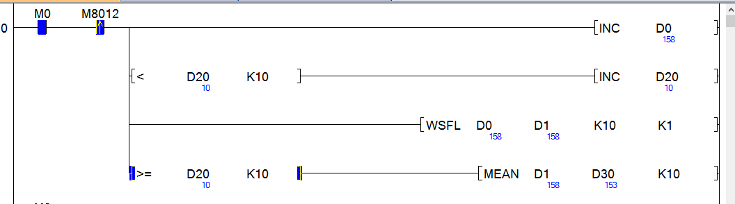 比如 LD M0 OUT T0 K999 MOV T0 D100 D100的每次都不同,大約80-90,我想取10次D100的數值,加起來后再除以10,取平均值,寫入D200。 D200也實時變化著,顯示最近10次的平均值。該怎么寫呢,謝謝! |