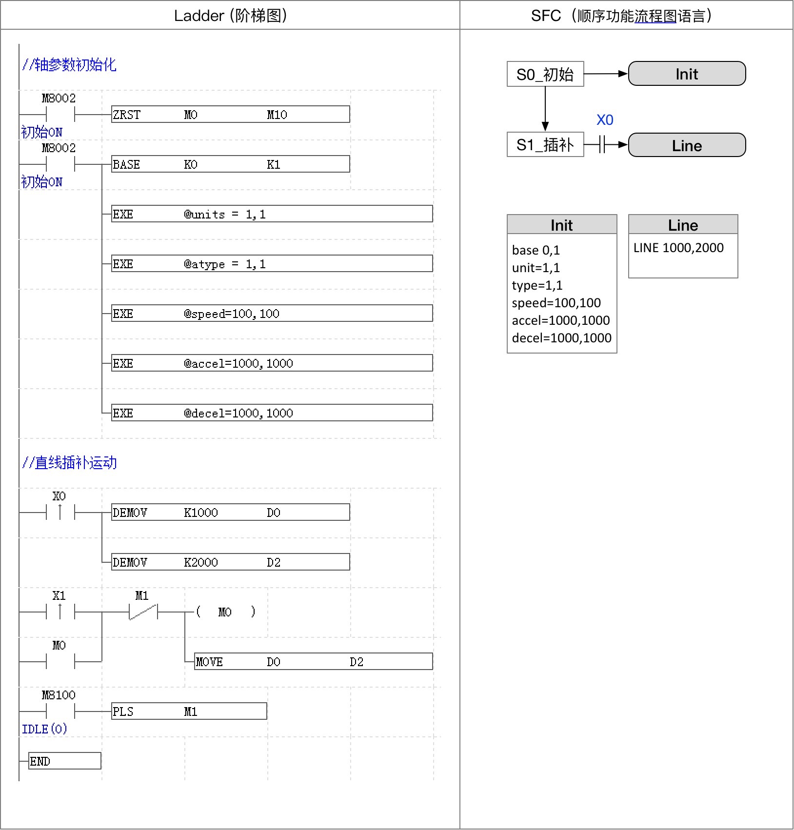 下面是以2種語言實現相同動作為例(兩軸直線插補運動)
