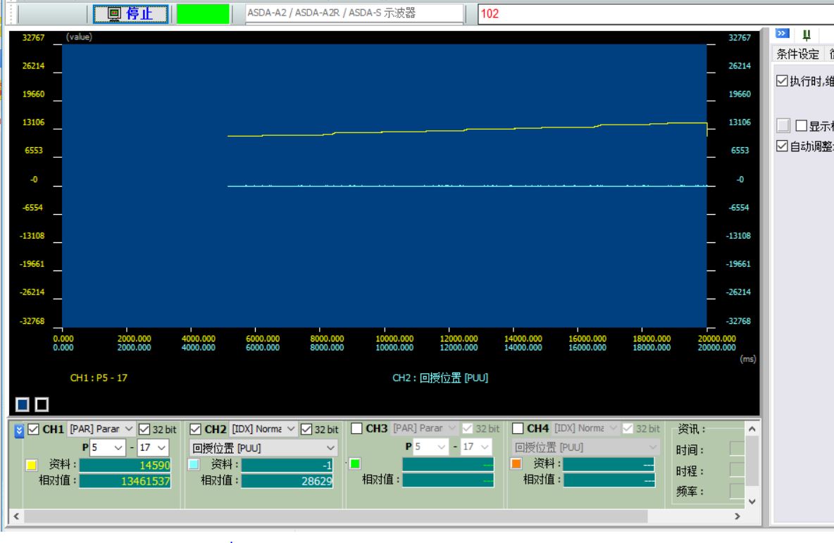 那位師父做過臺達A2伺服龍門同軸控制,現在用兩臺ASD-A2-2043-M 伺服驅動器來做同動控制,用定位模式控制,要求兩個電機位置,速度同時移動。知道臺達A2伺服有龍門控制這個功能,不知道有那幾個參數要設定?我把這幾個參數設為: P-00 002 , P-01 000 , P-44 640 , P-45 1 , P-46 2500 , P-72 10000, P-73 3000 , P-74 002 。通電驅動器報警 AL 040 把P73改為300000 也是報這個,不知道是怎么回事?接線 :軸1 CN1 的 ;21 OA ; 22 /OA ; 25 OB ; 23 /OB 對應接到軸2 CN5 ; 4 OPT A ; 5 OPT/A ; 3 OPT B ; 2 OPT/B 另外一臺反之也是這樣接,用軟件示波器臨控 回授位置數據和P5-17 數據時不一樣相差很大,電機沒啟動P-17數據也一直在變動。把CN5接頭扒掉時就停了,還有那里要設置或接線的嗎? |