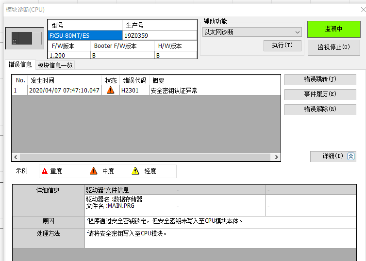 引用引用樓主楊勝剛123于2020-05-13 19:24發表的 FX5U主機出現error閃爍, plc診斷故障為2301錯誤,安全密鑰認證異常 :客戶新買的FX5U主機接二連三出現無法寫入程序或者寫入程序后出現error閃爍, plc診斷故障為2301錯誤,安全密鑰認證異常請問有知道怎么解決的嗎?