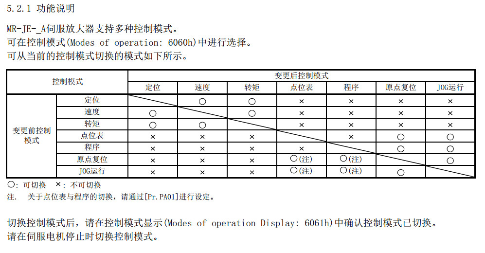 但是看了一下MR-JE的modbus說明,控制模式要單獨切換,而我伺服需要用到回原點、點動和多個定位點動作,