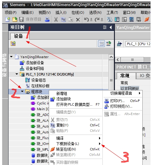 然后, 在博圖軟件打開程序后 ,點(diǎn)左側(cè)的項(xiàng)目樹,程序塊,右鍵,下載到設(shè)備-----軟件。