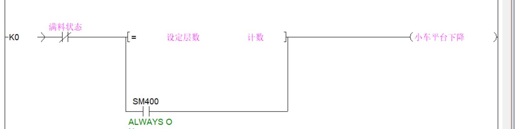 SM400(標注 “ALWAYS ON”):作為 PLC 運行狀態下的常通特殊輔助繼電器,為整個邏輯回路提供持續能流,確保 PLC 運行期間該邏輯被循環掃描、實時檢測。