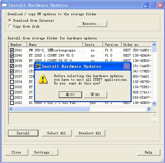 7.彈出警告窗口,在升級硬件時必須關閉所有的STEP7應用程序。直接點“是”,軟件自動關閉。