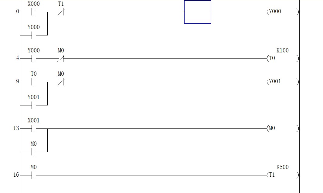 你的程序將面臨這樣一種尷尬,當執行一次后,由于M0屬于自保狀態,將導致T1持續輸出,從而X0將在第二次輸入時被屏蔽。