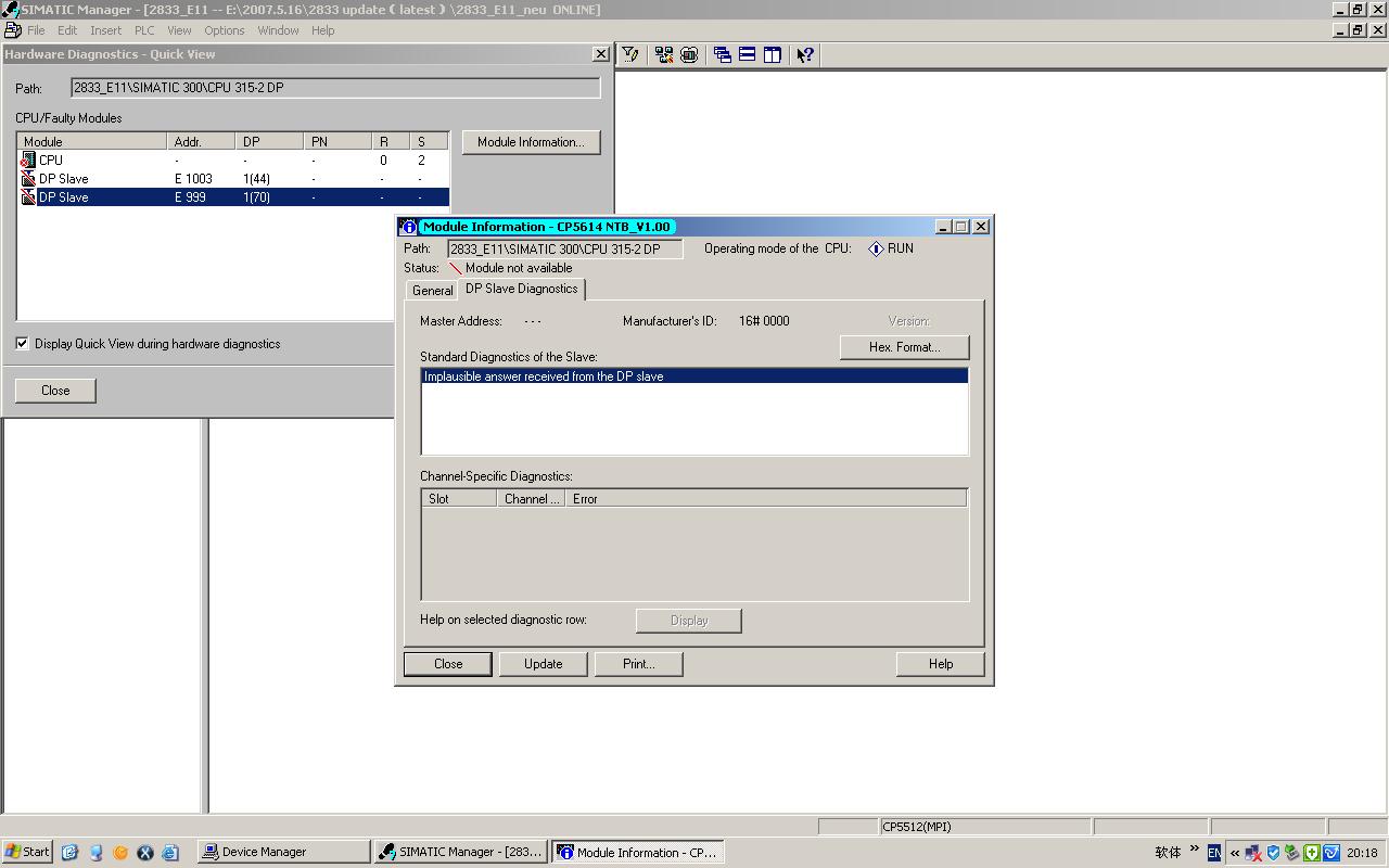 公司一臺設備電腦主板壞了,換了一臺電腦,但是無法打開軟件,報錯是界面無法打開。電腦上裝了一個CP5614的卡,DP地址為70。監控PLC發現如下情況,電腦端SET PG/PC試著選了幾個接入方式好像也不行。哪位大大幫忙分析一下,謝謝了。