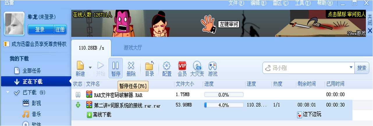 你看看,我剛截的圖,在后面,110K,30秒不到就4%了,速度也不慢啊,剛開始速度不算太快,20K,后來越來越快了,公司限制下載量,我不敢用太多,用超過了,就停止上網了,所以我趕快停了