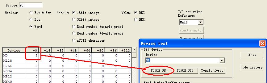 以三菱PLC為例。觸摸屏操作對象一般是M、D等元件,那么可以直接批量監控軟元件,通過點擊觸摸屏對應點,對比軟元件狀態或數值的變化,以快速找到對應點。
