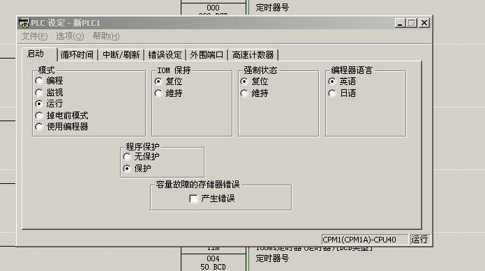由于剛學習歐姆龍的PLC,型號是CPM1A-40CDR-A,我把編程好的新程序傳送到PLC里面,老是有錯誤,之前我對PLC改動了一下,把運行模式改為掉電前模式,現在就出了這個問題,現在老的程序也不在運行狀態了(PLC的運行指示燈不亮),把PLC斷過電之后,然后送電,這樣PLC的運行指示燈就亮了,老的程序才能運行,發現一個怪現象,電腦和PLC連接好以后也就是連線了,PLC的運行指示燈是亮的,如果離線了,PLC的運行指示燈就不亮了,老程序工作不起來,然后把PLC斷電,然后再送電,PLC運行指示燈就亮了,這樣PLC就能動作了,就是沒辦法把新的程序傳到PLC里面,傳送不上去,請問各位老師是不是PLC設置哪里出問題了!請賜教!網上有哥們叫我把內存刪掉,也刪不掉,不知是哪里設置出問題了!還有就是軟件里的掉電前模式具體的是什么意思,還有錯誤日志是什么意思,搞不懂!