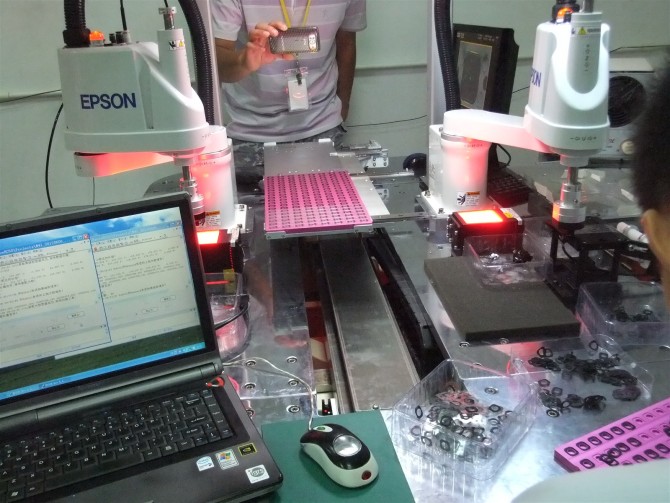 也考慮過用振動盤,領導擔心對產品表面有損害。準備在上料的時候拍照,一個要求一定要取產品中心,二個是拍出三個角的位置。現在用白色環形光效果不是很好。下放產品位置也安裝一個相機,來確認要放產品孔的位置。其實我也想過來料時確定產品位置和放產品位置,可這個機械無法保證。