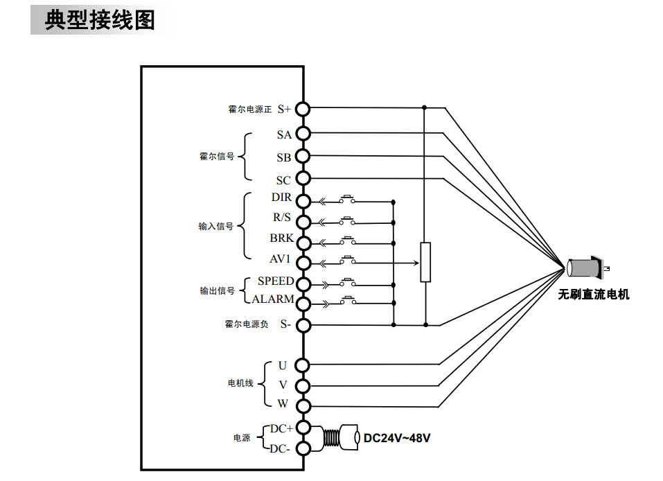 無刷直流電機的驅動 是外部供電的 0~~~10V 直流電壓 S- 接負極 正極 要控制信號端子通過PLC 輸出再直流電機驅動器就好了。 |