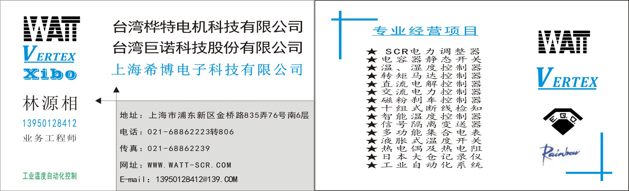 ※主要產品有臺灣樺特WATT電力調整器(SCR)又稱晶閘管可控硅、功率調整器、調功器(W2 W3 W5 M5 WS)系列;※巨諾溫控儀器儀表VERTEX(VT4826 VT7226 VT9626 VT9630等)、傳感器;※臺灣運泰比例連動、變位式捲取、放料控制器;※臺灣儀控溫度控制器TAIE(FY400 FY700 FY900 FA200 FA211等);※并承接工業自動化PLC、HMI、伺服系統設計與信息系統融合;※自動PID溫度控制系統等。