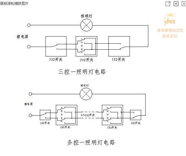 近來回家安裝線路(自己家的),兩個開關控制儀個燈,我想了很久才明白怎么控制。