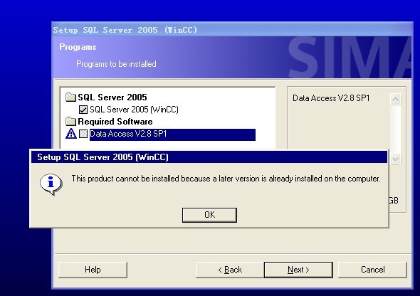 前面已經說過了,Wincc附帶的SQL,非通用版,也就是意味著,任何安裝有通用版或者其他一切SQL都將被必須被卸載,包括Vs軟件中的sQL。 Regards |