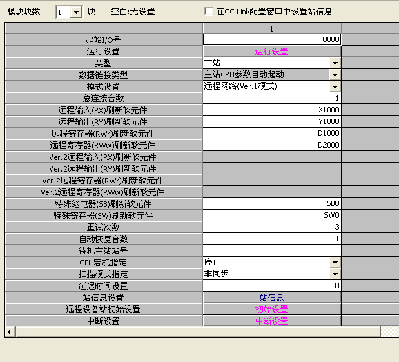 I/O里面沒必要設定具體模塊型號,你把起始點弄好就可以了,CC-LINK通訊主要設置是在網絡參數里面設置的,比如遠程通訊起始輸入輸出點,起始字地址