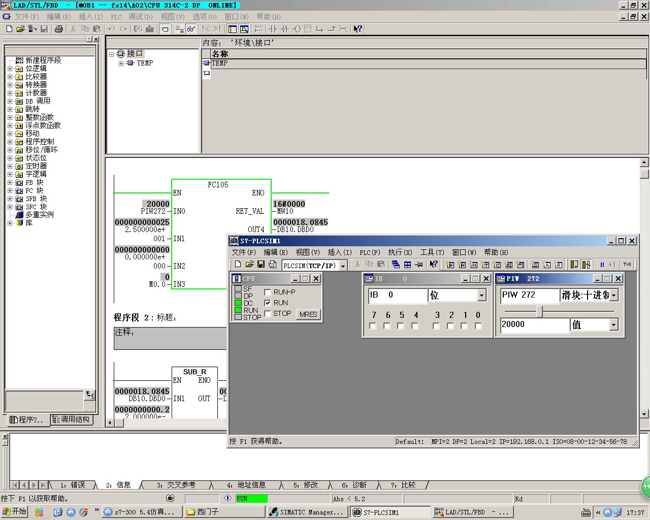 從你14樓的程序來看,程序是調用了FC105塊,是轉換、計算線性模擬量的程序塊。