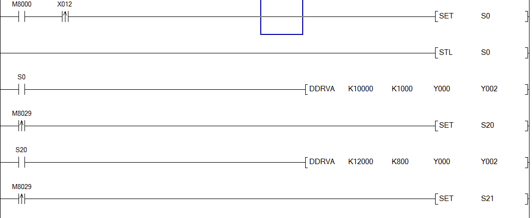 隨便寫了個程序,想測試下STL步進指令下定位指令的功能,程序如上圖,功能是單一電機多段速,第一段能夠執行,但是第二段定位指令就不動作了,請各位高手指點,謝謝!