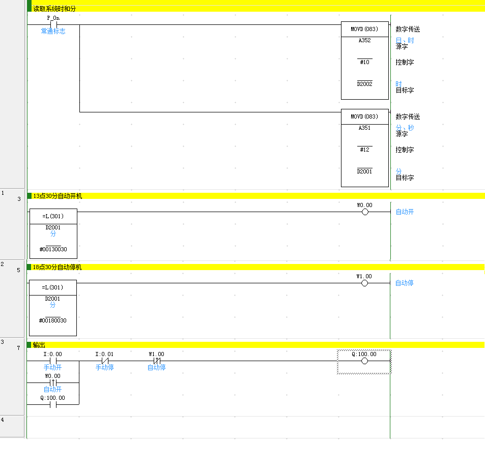 大家好,請問一下歐姆龍PLC用時間指令作比較,怎么用,比如13點30分驅動電機運行,18點30分停止運行怎么編寫程序。。。
