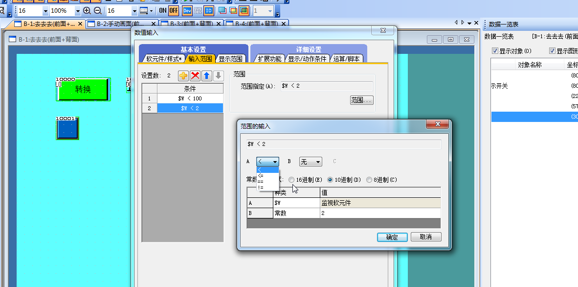 觸摸屏添加一個數值輸入  在輸范圍內 選擇范圍符號  怎么沒有大于號  或者大于等于號