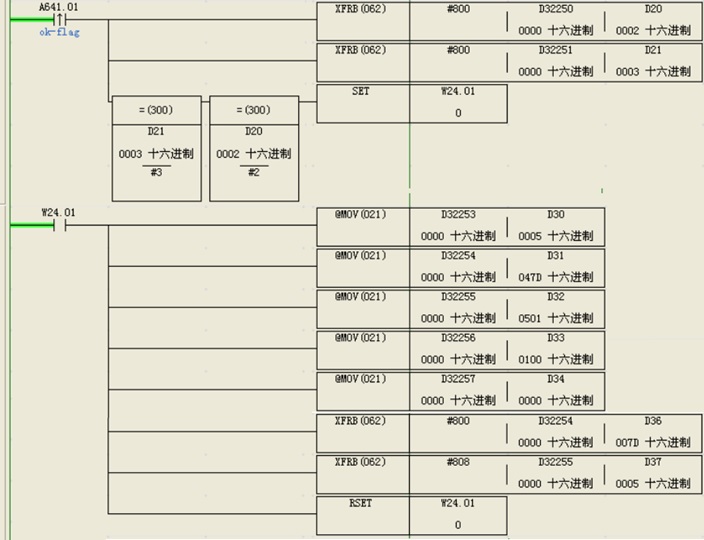 最近做個(gè)稱重儀表通訊的程序,前面用三菱的485通訊口,然后用RS指令已經(jīng)通訊成功,寫入讀取都沒(méi)有問(wèn)題。 最近換用歐姆龍的,出了些問(wèn)題,一頭霧水,求大神幫忙看看問(wèn)題出在哪! 現(xiàn)在正在試驗(yàn)的板子,CP1E+CP1W-CIF11。CIF11撥碼 0 1 1 0 1 1 。 用串口調(diào)試工具能讀取儀表的數(shù)值,寫入也沒(méi)有問(wèn)題。 串口調(diào)試工具也能接收到PLC發(fā)送出來(lái)的數(shù)據(jù),不過(guò)格式是有問(wèn)題的,完全看不懂。這就說(shuō)明硬件和接線應(yīng)該是沒(méi)有問(wèn)題的。 歐姆龍發(fā)送數(shù)據(jù)的格式真是讓人一頭霧水,稀里糊涂的,研究半天大概是看懂了! 然后PLC程序如下 LD P_On mov #1 d1300 mov #10 d1301 mov #7 d1302 mov #0013 d1303 mov #0001 d1304 mov #0200 d1305 mov #0000 d1306 LD w10.00 OUT A641.00 我用的是485端口,每次發(fā)送數(shù)據(jù)之后,A641.01沒(méi)有動(dòng)作,大概4S之后 A641.02置1,D1352的報(bào)警代碼是 #0080(響應(yīng)超時(shí)) 請(qǐng)教大神門,我這問(wèn)題出在哪里! 需要CRC校驗(yàn)碼嗎?校驗(yàn)碼怎么放,從哪個(gè)寄存器開(kāi)始,是在一個(gè)寄存器,還是分開(kāi)放在兩個(gè)寄存器。 搞了一天,搞糊涂了。 |