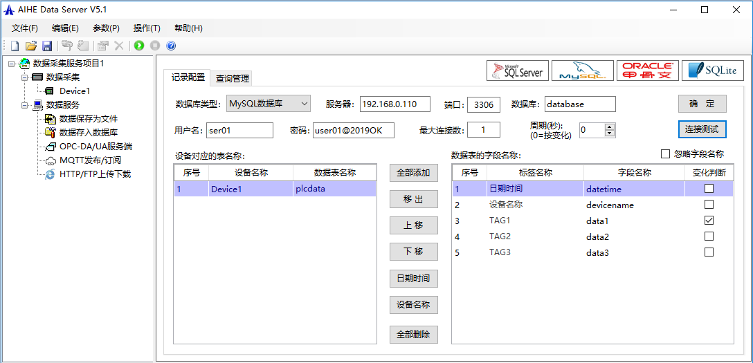4.設置數據庫參數:標簽添加完成后,選擇‘數據服務’中的‘數據存入數據庫’的節點,打開數據庫的設置頁面,設置數據庫相關參數,如下圖,當TAG1的數值有變化時,就往數據庫里面插入一條記錄。