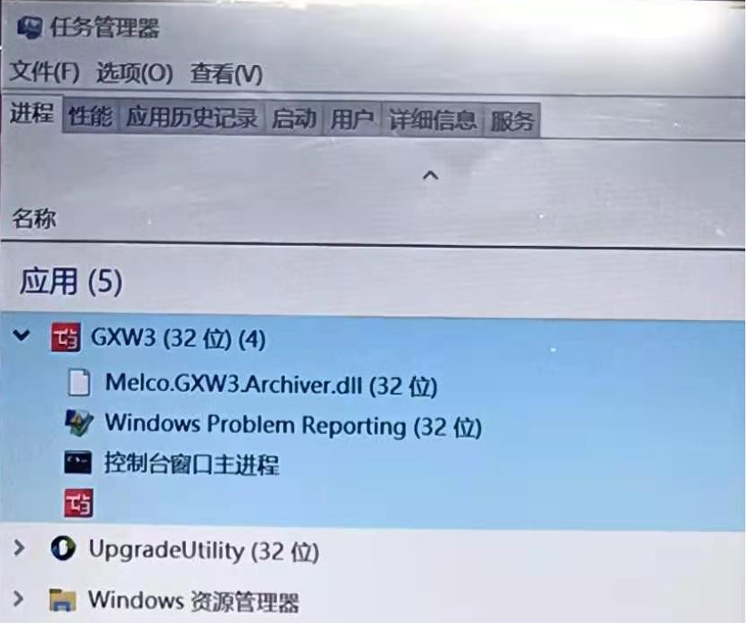 雙擊桌面圖標啟動gx works3,過幾秒鐘后軟件自動關閉了,查看任務管理器\進程\應用窗口,出現這樣的圖片,不知為何?請高手指點