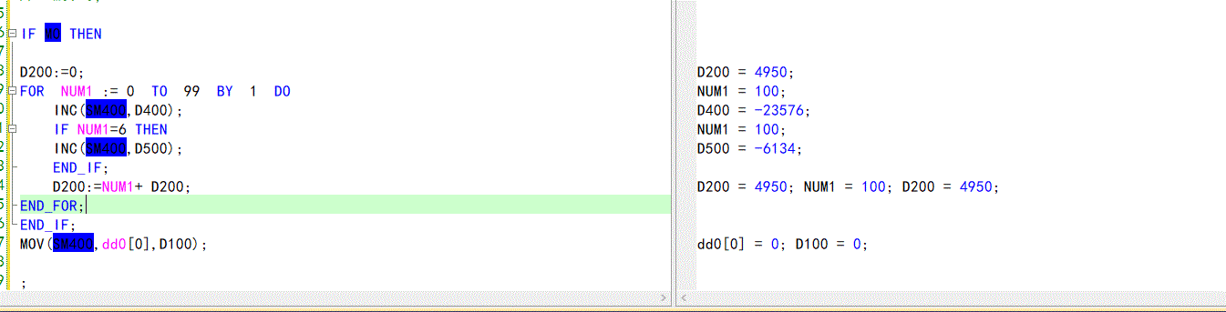 IF M0 THEN FOR num:=0 TO 99 BY 1 DO INC(SM400,D400); IF num=6 THEN INC(SM400,D500); END_IF; END_FOR; D200:=num+D200; END_IF; IF D400=100 THEN M0:= FALSE; END_IF; FOR循環開始時都會初始化循環變量,你這樣寫PLC每個掃描周期都會增加100。 |