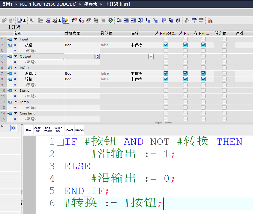 在FB1 做了個(gè)上升沿  當(dāng)按鈕信號(hào)由0變1時(shí)  沿輸出一個(gè)掃描周期  不知是不是你想要的    S7-1200有現(xiàn)成的指令