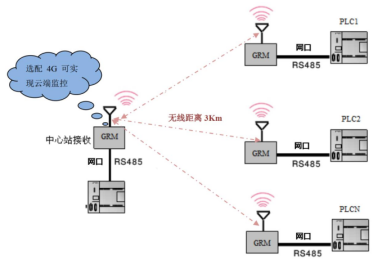 PLC需要接收傳感器的信號,或者控制設備啟停,但是現場條件復雜,不方便架線,就可以利用GRM110自帶的I/O來采集或者控制設備,同時通過無線發送和接收PLC的控制命令。