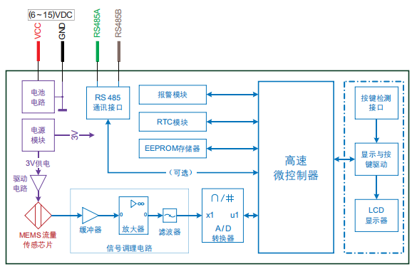 該流量計同時實現熱源的產生與溫度的測量。當芯片處于工作狀態時,在傳感器的周邊形成穩定的溫度場分布。一旦一定質量的氣體流過傳感器時,氣體的流動將破壞該溫度場的分布,形成特定的、取決于該氣體的質量和速度的溫度場分布。微機電系統流量計芯片上的傳感器將測量這一變化并把這一變化轉換為電信號,由一個專門的電路變送器對此信號進行放大、調理并作線性化處理。由于不同質量的氣體對傳感器的周邊形成穩定的溫度場分布所產生的擾動不同,因而能測量氣體的質量流量或總流量。下圖為該系列流量計的原理框圖。
