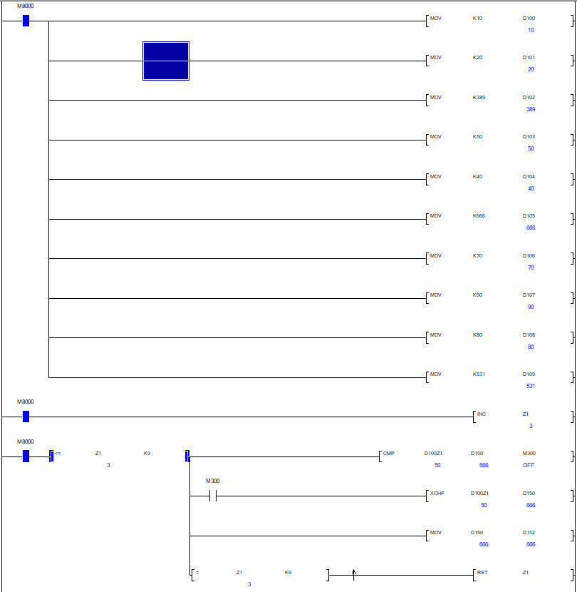 FX3U用比較指令求連續數據的最大值思路,同理也可以找出最小值。這里比較(d100---d109連續10個數)