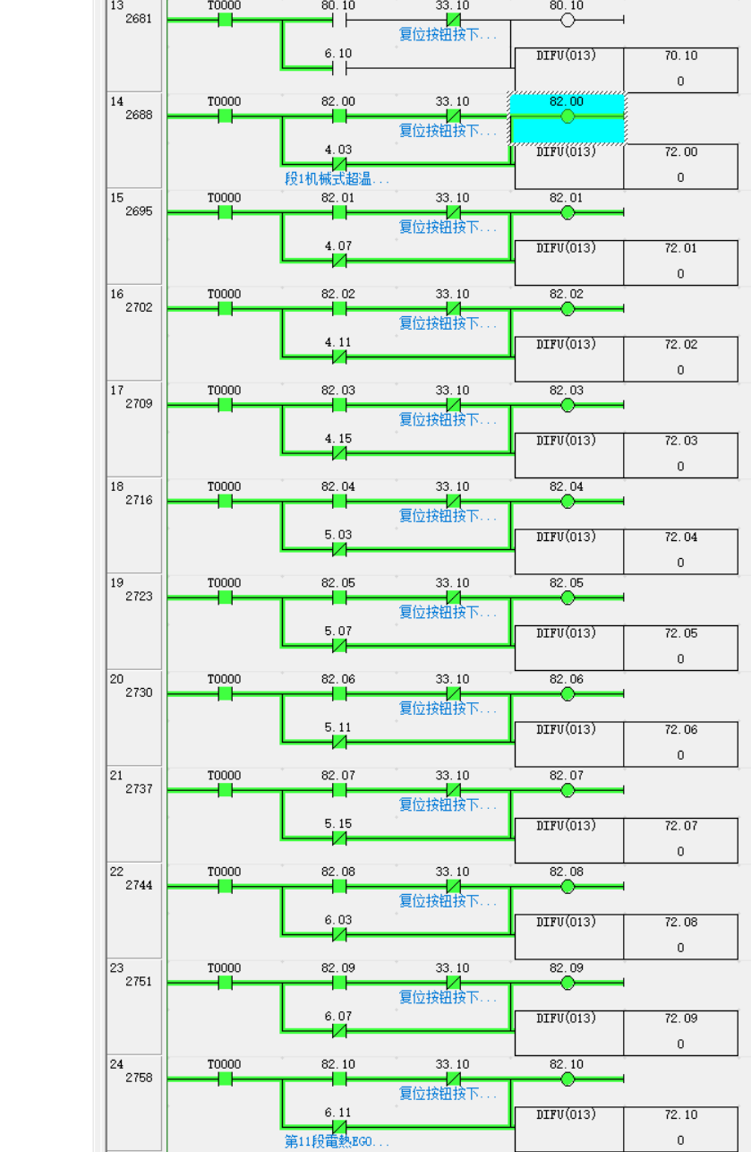 該程序段13第3029步中CMP(020) 82 #0 模擬時的值為2047,沒有搞明白這2047怎么來的,程序中沒有搜索到與之關聯的地方,導致87.02一直輸出。請大家指點!謝謝! |