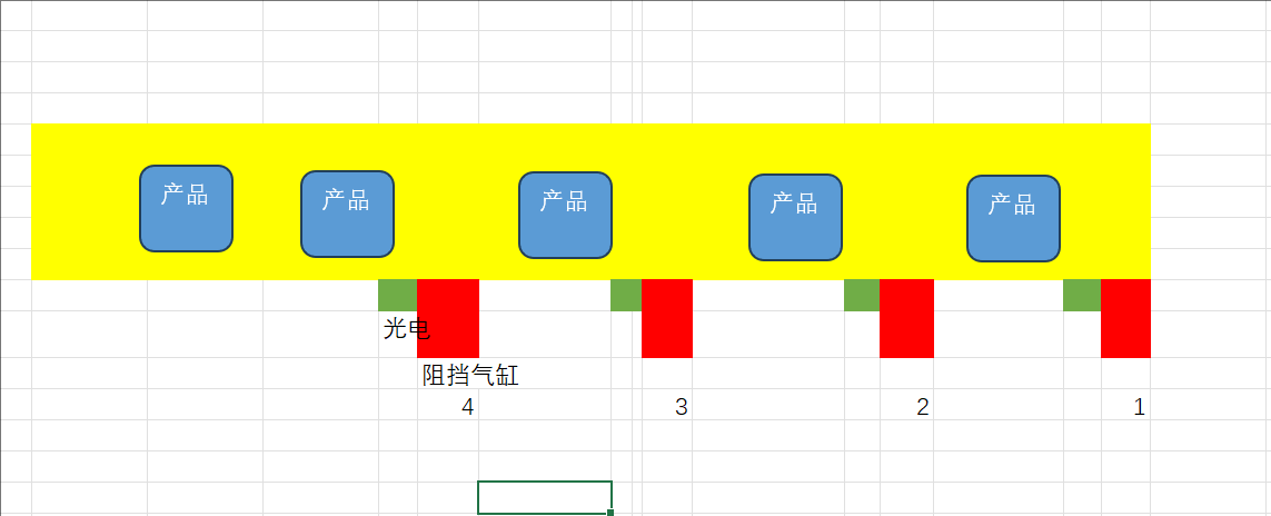 皮帶線阻擋氣缸控制:黃色是皮帶線,綠色是光電感應,紅色是阻擋氣缸。  怎樣控制阻擋1234順序阻擋。  放行1,然后234補上。