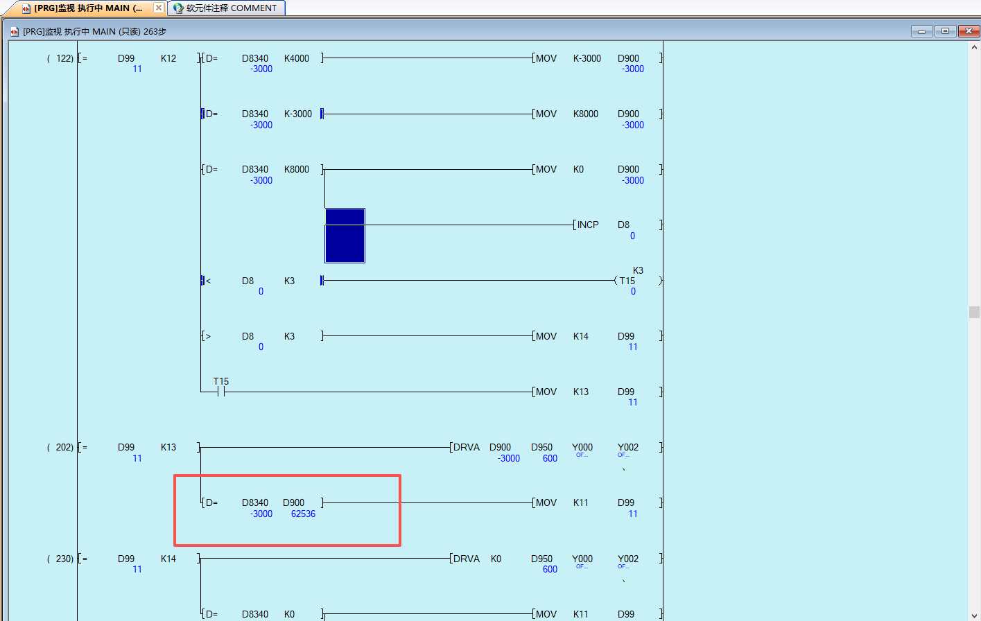 這是PLC寄存器的一種機制,16位寄存器運算結果為負數時,寄存器監視看到的是補碼后的二進制(-3000補碼后的二進制轉換成十進制就是62536)。運算過程為:把3000的二進制000101110111000取反→1111010001000111再+1→1111010001001000→轉換成十進制→62536