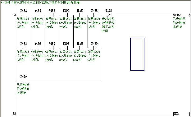 ![]() 一、定時(shí)觸發(fā)故障PLC程序(PLC為實(shí)時(shí)時(shí)鐘) 該程序是用三菱PLC編程軟件GX Developer V7.08J(SW7D5C-GPPW)簡(jiǎn)體中文版所編的程序,僅適用于三菱FX2N系列PLC。 該程序是為設(shè)備制造商收取剩余款項(xiàng)而設(shè)的籌碼,在設(shè)備制造商老板有要求時(shí)可以使用,僅適用于信譽(yù)度不好的客戶。該程序一旦觸發(fā),無(wú)論設(shè)備是否處于運(yùn)行狀態(tài)、PLC是否處于運(yùn)行狀態(tài)或通電狀態(tài),指定時(shí)間以后將會(huì)準(zhǔn)時(shí)出現(xiàn)故障。請(qǐng)謹(jǐn)慎使用! 該程序應(yīng)當(dāng)嵌入應(yīng)用程序之中,為避免他人識(shí)破,可以將程序分成多塊分別嵌入在應(yīng)用程序的各個(gè)地方。 為避免他人修改你的程序,應(yīng)當(dāng)將整個(gè)程序進(jìn)行加密——設(shè)置口令,具體操作方法請(qǐng)參閱程序加密的相關(guān)說(shuō)明。 M490為故障觸點(diǎn),應(yīng)當(dāng)串聯(lián)或并聯(lián)在程序多個(gè)關(guān)鍵動(dòng)作回路中。 X20為定時(shí)觸發(fā)故障復(fù)位端子,要求該端子為沒(méi)有被使用的端子(否則請(qǐng)更換為另一個(gè)沒(méi)有被使用的端子)。需要解除還沒(méi)有被觸發(fā)的故障或已經(jīng)觸發(fā)的故障時(shí),將該觸點(diǎn)和PLC的輸入COM端短接即可。如果系統(tǒng)當(dāng)前時(shí)間還沒(méi)到故障觸發(fā)時(shí)間,一旦該端子與COM端子斷開(kāi),故障將在預(yù)定時(shí)間觸發(fā)!如果系統(tǒng)當(dāng)前時(shí)間已經(jīng)過(guò)了指定的故障觸發(fā)時(shí)間,一旦該端子與COM端子斷開(kāi),故障將立即觸發(fā)!如果需要重新指定故障觸發(fā)時(shí)間,就必須得更改指定的故障觸發(fā)時(shí)間——需要對(duì)PLC進(jìn)行編程! 該程序指定的故障觸發(fā)時(shí)間為2007年1月1日0時(shí)0分0秒,可以進(jìn)行更改。 該程序中所用到的通用繼電器M481-M499、定時(shí)器T198、存儲(chǔ)區(qū)D0-D5,請(qǐng)不要在程序的其它地方使用,否則該程序可能無(wú)法正常發(fā)揮作用。 對(duì)于三菱其它系列PLC或其它品牌PLC,請(qǐng)對(duì)程序作相應(yīng)更改——各存儲(chǔ)器請(qǐng)按照相應(yīng)存儲(chǔ)區(qū)域進(jìn)行更改。 該程序并沒(méi)有修改PLC的系統(tǒng)時(shí)鐘,因此程序中的其它地方或和PLC通信的其它設(shè)備所調(diào)用的PLC系統(tǒng)時(shí)鐘反映的是正確的當(dāng)前日期和時(shí)間。 在程序動(dòng)作之前,應(yīng)當(dāng)檢查PLC的系統(tǒng)時(shí)鐘是否正確反映當(dāng)前日期和時(shí)間(因?yàn)镻LC的默認(rèn)系統(tǒng)時(shí)鐘可能不正確,筆者就遇到過(guò)系統(tǒng)時(shí)鐘快一個(gè)小時(shí)多一點(diǎn)的情況)。檢查方法如下: 啟動(dòng)三菱PLC編程軟件GX Developer V7.08J(SW7D5C-GPPW)簡(jiǎn)體中文版到一個(gè)新的窗口,將電腦與PLC正確連接(具體連接方法請(qǐng)參閱相關(guān)說(shuō)明<比如采用SC09連接電纜或等同功能電纜,加接USB轉(zhuǎn)RS232電纜(需要加安裝驅(qū)動(dòng))等等>),然后點(diǎn)擊“在線”——“PLC讀取”——“確認(rèn)”(對(duì)于部分筆記本電腦(比如頂星品牌龍尊系列某型號(hào)的筆記本電腦),默認(rèn)串口為COM2,這種情況下需要將COM口選為COM2,具體操作方法不再贅述),然后選中“軟元件內(nèi)存”再點(diǎn)擊“確定”......待軟元件內(nèi)存?zhèn)魉偷诫娔X以后,馬上檢查M8018(年)、M8017(月)、M8016(日)、M8015(時(shí))、M8014(分)、M8013(秒)是否大概是當(dāng)前正確時(shí)間(請(qǐng)注意,軟元件內(nèi)存只是下載時(shí)的PLC內(nèi)存,并不能實(shí)時(shí)反映PLC的當(dāng)前軟元件內(nèi)存數(shù)據(jù)。所以,軟元件內(nèi)存數(shù)據(jù)中反映的系統(tǒng)時(shí)鐘比PLC當(dāng)前系統(tǒng)時(shí)鐘要慢)。或者,采用另外一種更簡(jiǎn)單的方法:直接PLC在線連接的下拉菜單中選擇PLC時(shí)間設(shè)置選項(xiàng),然后就可以看見(jiàn)非實(shí)時(shí)顯示的時(shí)鐘了——這個(gè)時(shí)間是讀取瞬間的時(shí)鐘,不實(shí)時(shí)跟隨。 如果PLC的系統(tǒng)時(shí)鐘不能正確反映當(dāng)前日期和時(shí)間,那就需要對(duì)軟元件內(nèi)存進(jìn)行修改。修改方法為:1、直接PLC在線連接的下拉菜單中選擇PLC時(shí)間設(shè)置選項(xiàng),然后更改時(shí)間就可以了。但該方法一次性只能更改一回時(shí)間,一旦更改后時(shí)間就實(shí)時(shí)跟隨了,無(wú)法再進(jìn)行更改。如果需要再次更改,需要將該窗口關(guān)閉后重新打開(kāi),然后再進(jìn)行時(shí)間的更改。 2、通過(guò)程序的相關(guān)指令(例如MOV指令寫(xiě)時(shí)間對(duì)應(yīng)的特殊存儲(chǔ)區(qū)D8013~D8018或通過(guò)TWR指令來(lái)寫(xiě)時(shí)間,具體指令此處就不再贅述了)。 通過(guò)讀出軟元件內(nèi)存后修改軟元件內(nèi)存再寫(xiě)回去的方法是行不通的——經(jīng)過(guò)多次試驗(yàn),證明了PLC在寫(xiě)入軟元件內(nèi)存時(shí)根本不會(huì)重寫(xiě)特殊存儲(chǔ)區(qū)的內(nèi)容,也就是說(shuō)特殊存儲(chǔ)區(qū)沒(méi)被列入“軟元件內(nèi)存”的范圍之內(nèi) 二、定時(shí)觸發(fā)故障PLC程序(PLC非實(shí)時(shí)時(shí)鐘) 該程序是用三菱PLC編程軟件GX Developer V7.08J(SW7D5C-GPPW)簡(jiǎn)體中文版所編的程序,僅適用于三菱FX2N系列PLC。 該程