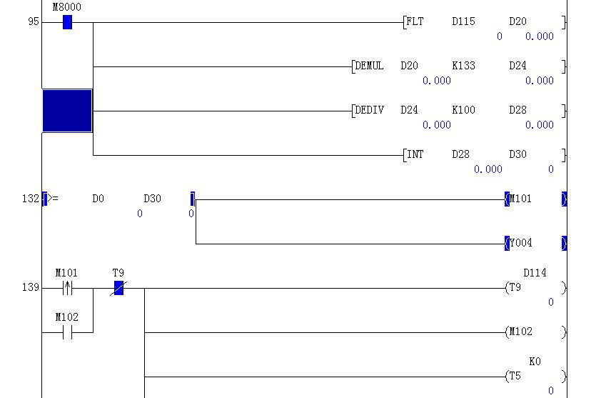 ,這個程序我一直沒搞明白,請大家指教,我知道模擬量讀取以后,把他變成浮點數,乘以常數133,然后在除以100,這個100是什么意思。他這個程序是在文本顯示器上顯示壓力數據的,0-10V輸入,變成0-30MPa。D115寄存器是預置壓力,132部到160部我不太明白,希望大家指教。注:我只知道這幾步實現的是在文本顯示器上預置一個時間,(保壓時間),然后驅動一個指示燈亮,等保壓時間過了,指示燈熄滅。