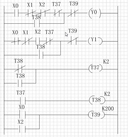 實現同樣的功能要求可以編出不同的程序,第一程序圖是亮0.1S,滅0.1S的閃爍,可能是亮滅閃爍間隔0.2秒是指一個閃爍周期為0.2秒吧,否則將K1改成K2才能為0.2S閃爍. 你自己編的程序要把三個并聯T38常開接點刪除. |