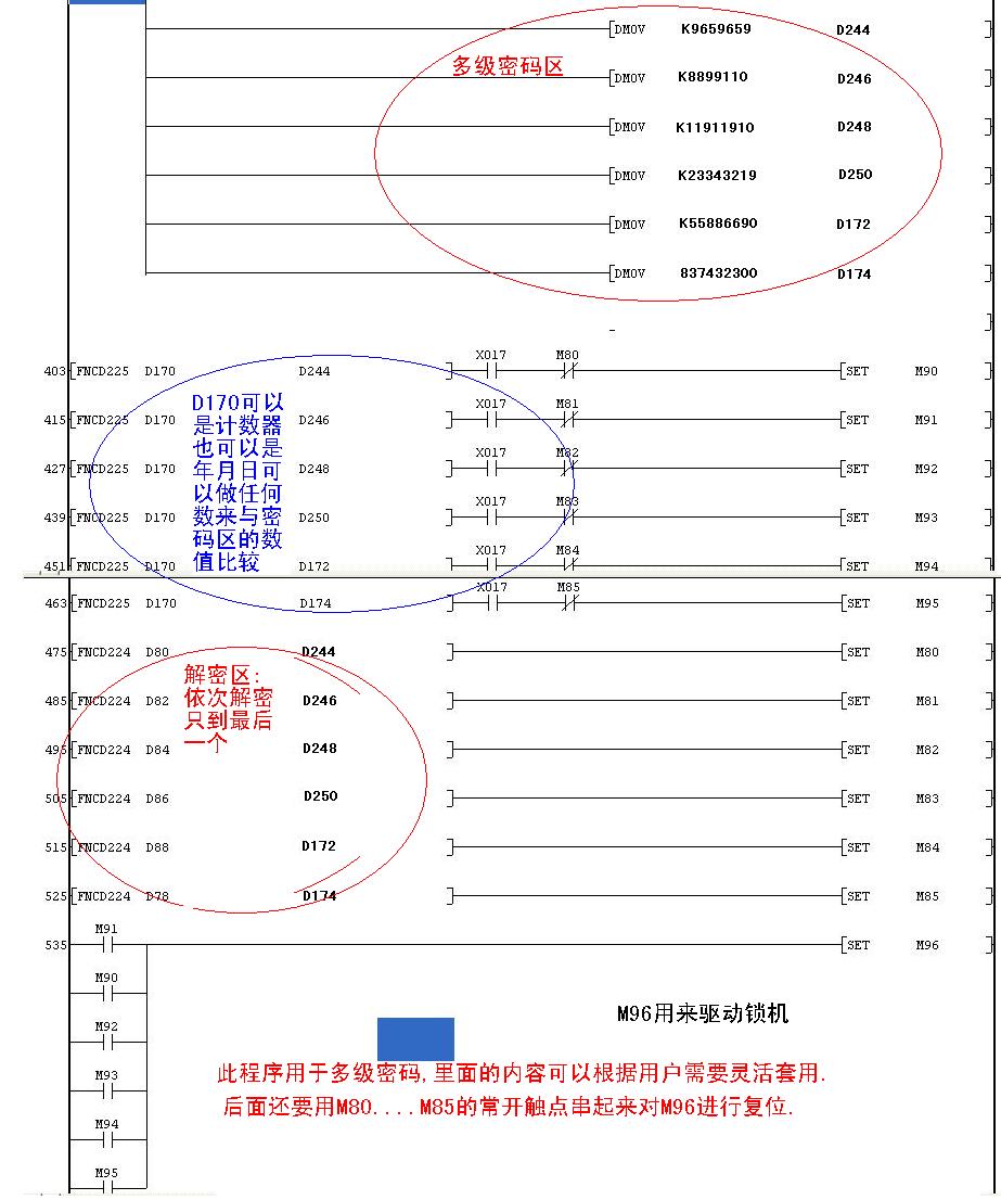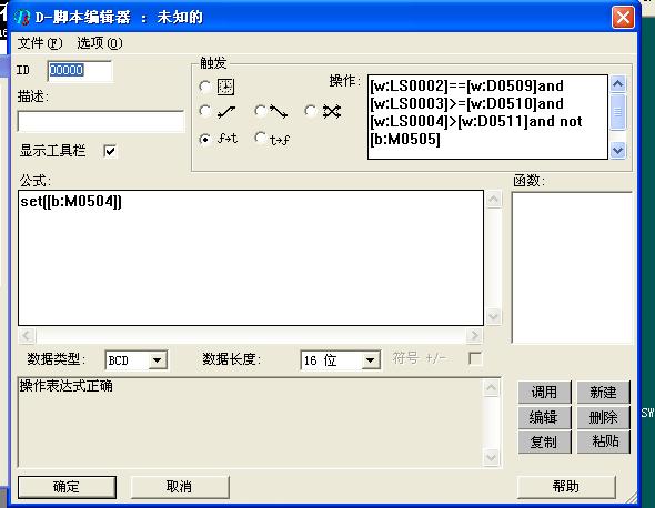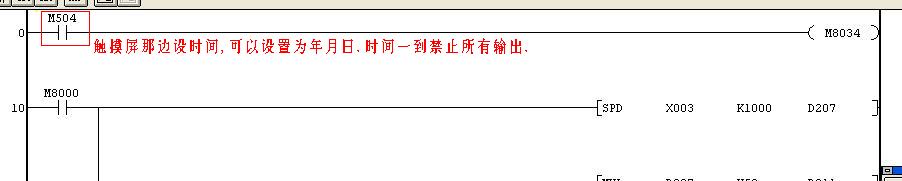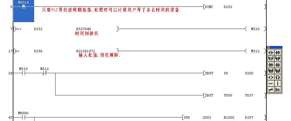 我今晚加班將這三個程序整理了傳上來,請站長指導(dǎo). 這是第一個 要點在屏上,FX2NPLC里面可以不做程序,屏里可以直接驅(qū)動FX2N輸出禁止繼電器.只要時間到屏上可以打出故障提示. 設(shè)備故障停機,請與廠商聯(lián)系的字樣. ![]() 看不清我寫助記符: LD M504 OUT M8034 在屏里面寫腳本程序 D509代表年 D510代表月 D511代表日 M504鎖機 M505解除鎖機 [ 此帖被易志剛在2009-03-23 21:25重新編輯 ] |