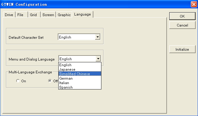 點(diǎn)菜單File--->Configuration---->GTWIN Configuration,在彈出的對話框Language選項中第2個下拉框中選擇"Simplifiled Chinses",如下圖所示: