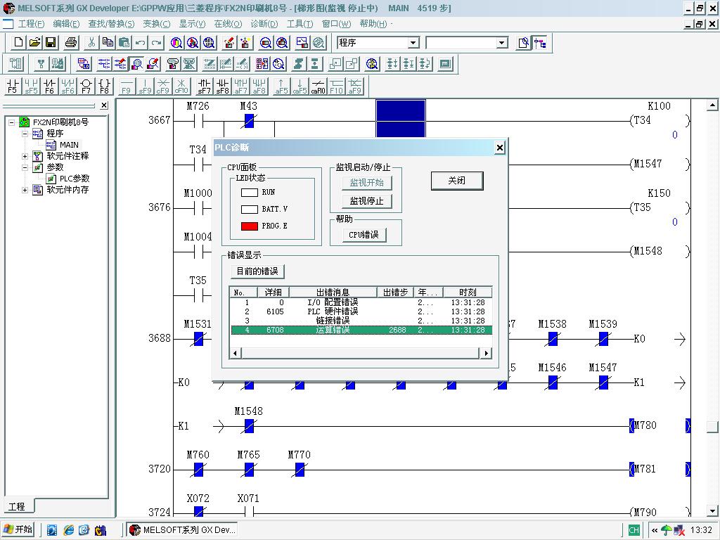 今天在辦公室試驗(沒有任何外部設備),PLC開始運行正常,幾個小時候之后突然出錯,錯誤有4個,分別是IO錯誤,硬件錯誤,鏈接錯誤,運算錯誤,圖在附件,程序也在附件,可能大家都沒碰到過,有興趣的朋友看看吧。 4臺PLC都是這個癥狀。 |