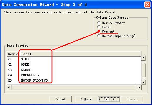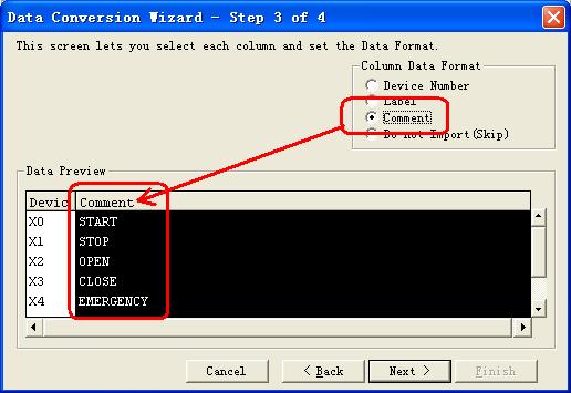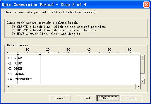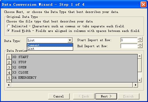在“Original Data Type”選項中設定文檔類型。“Delimited”是間隔的意思,一般如果導入的文檔為CSV格式時選擇該項,那么在下一步中向導會自動分開軟元件和注釋;“Fixed Width”是固定寬度的意思,一般如果導入的文檔為TXT格式時選擇該項,便于下一步手動建立分隔線。