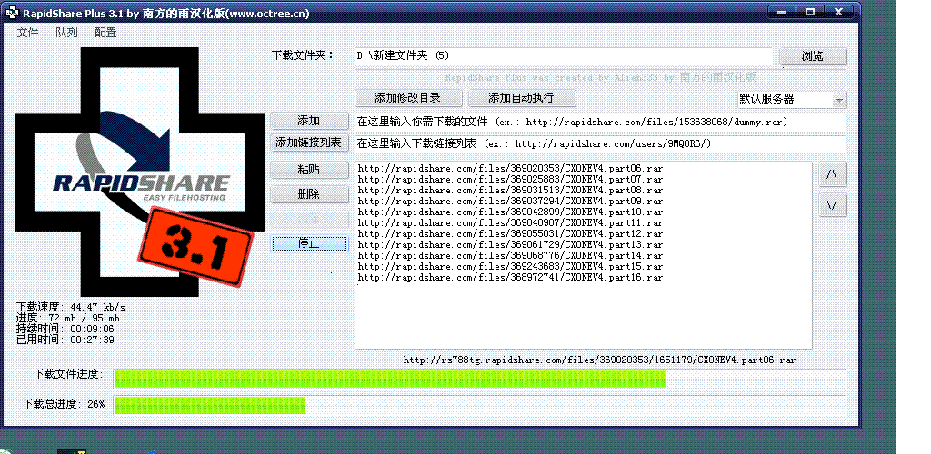 2.把以上16個地址復(fù)制全部添加到RapidShare Plus v3.1里面后(如最上面圖片,我已下了5個),點(diǎn)下載就OK,非常簡單. 自動全部下載.