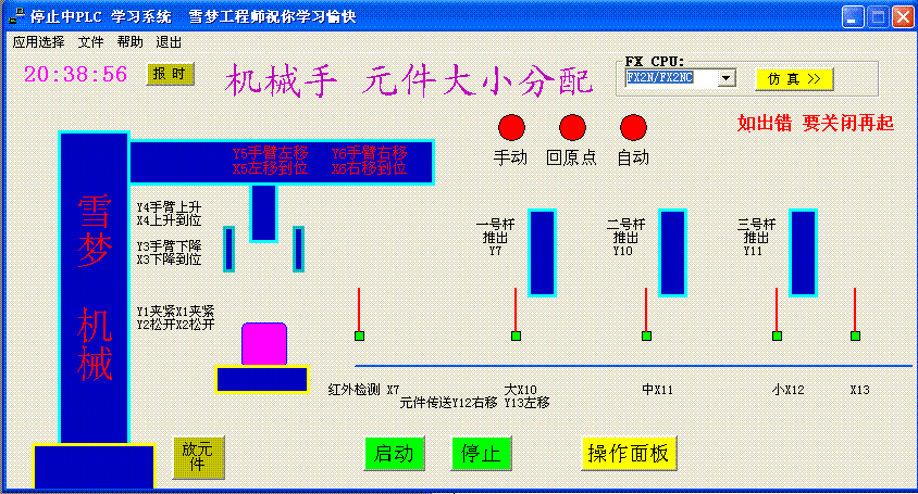 首先到http://www.yunduan.cn/ 云端下載云端軟件 下載三菱 GX Developer 8.86 (中文版) http://u.115.com/file/f19d261b8a GPPW8.86.lva 導入 即可直接使用,不再需要安裝。 注:下載本軟件若需要提取碼,請輸入 f19d261b8a 機械手PLC仿真學習 ![]() 第一步GX DeveloperPLC程序編寫后,運行梯形圖邏輯測試。 第二步啟動機械手PLC仿真模擬學習軟件,點擊仿真按扭進行。 圖示: ![]() [ 此帖被夏日雪夢在2010-07-09 08:20重新編輯 ] |