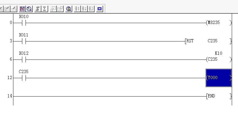 你用C235,在程序中就不可以出現X0,因為X0是做為計數的輸入接口,也就是說編碼器接在X0,并且C235的線圈要時刻接通