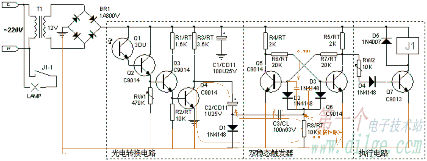 引用引用第31樓風(fēng)流過(guò)客flgk于2011-01-19 20:55發(fā)表的 : 謝謝工控學(xué)子的多次指點(diǎn)我把光電電路和雙穩(wěn)態(tài)電路分離開(kāi),把光敏電阻用10K電阻替代。并把10K電阻的正電源端懸空以作碰觸。C2換為10UF.未觸發(fā)時(shí),C2與D1中間和地之間的電壓為幾毫伏,觸發(fā)時(shí)電壓為—14V,(RW1調(diào)至330K),沒(méi)試驗(yàn)幾次Q4燒毀,換新后,再試驗(yàn),幾次,Q4不觸發(fā),因下班,未及查明原因 [attachment=54474]